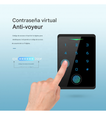 Descripción del producto: Dispositivo independiente de control de acceso que permite la apertura de puertas mediante huella digital, tarjeta RFID o código PIN. Ideal para sistemas de seguridad en hogares, oficinas y locales comerciales. Su diseño compacto y resistente permite una instalación rápida y fiable. Características principales: Tres métodos de acceso: huella digital, tarjeta RFID y código PIN. Lector de huella de alta precisión y rápida respuesta. Capacidad de almacenamiento para múltiples usuarios. Teclado táctil numérico retroiluminado. Compatible con cerraduras eléctricas, magnéticas y controladoras de acceso. Funcionamiento autónomo sin necesidad de PC. Señal sonora e indicadores LED de estado. Carcasa resistente para uso interior o exterior techado. Funciones: Registro y gestión de usuarios (huella, tarjeta y PIN). Activación de apertura eléctrica. Función de alarma en caso de intentos fallidos repetidos (según versión). Salida de relé para control directo de cerradura. Entrada para botón de salida. Modo autónomo o como lector esclavo (dependiendo de la configuración). Especificaciones técnicas: Alimentación: 12V DC. Tipo de tarjetas: RFID 125 kHz (estándar). Capacidad de huellas: según versión, comúnmente entre 500 y 1000. Distancia de lectura de tarjeta: 3–6 cm. Tiempo de reconocimiento: menor a 1 segundo. Conexión: relé, Wiegand IN/OUT (en versiones compatibles). Instalación: empotrado o sobre pared. Aplicaciones: Viviendas y portones. Edificios y oficinas. Comercios y depósitos. Sistemas de acceso con múltiples usuarios.