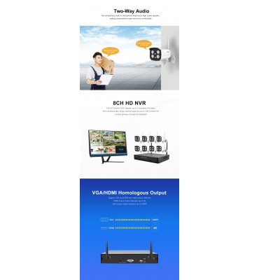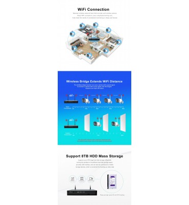 7. Soporte de modo puente inalámbrico: rango wifi de hasta 60 metros entre NVR y cámras.