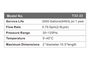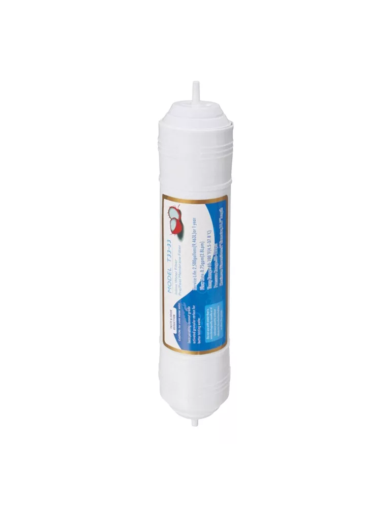 El filtro T33 es un **post-filtro de carbón activado** utilizado en sistemas de purificación de agua, especialmente en equipos de ósmosis inversa Su función principal es eliminar cualquier sabor u olor que pueda quedar en el agua después de haber sido filtrada por todo el sistema Además, ayuda a eliminar compuestos volátiles, sabores y olores indeseados, y tiene una gran capacidad de retención de partículas, especialmente polvo.